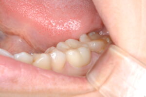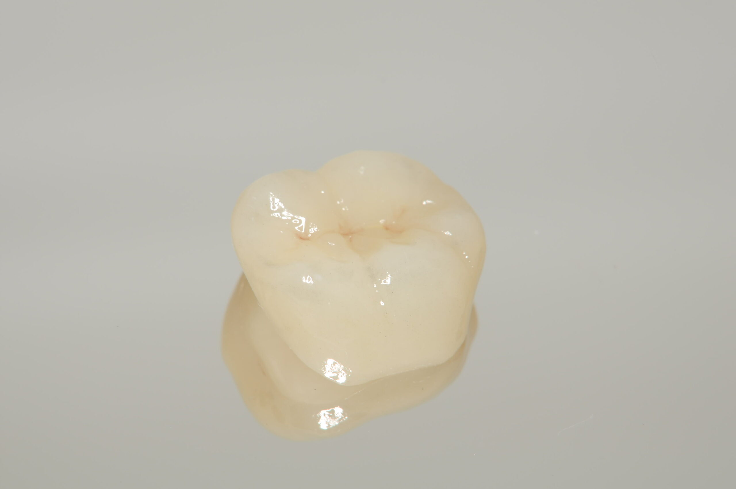 | 治療内容 | 元々大きな詰め物が入っており、残存歯質の一部にカリエス(虫歯)を認めたため、カリエスを除去後、支台歯形成を行った。その後一定期間仮歯で問題ないことを確認し、最終補綴処置に移行した。今回のケースは患者の咬合力が強いことと、ブラキシズム、食いしばりの可能性があることからオールジルコニアクラウンを用いて補綴処置を行った。 |